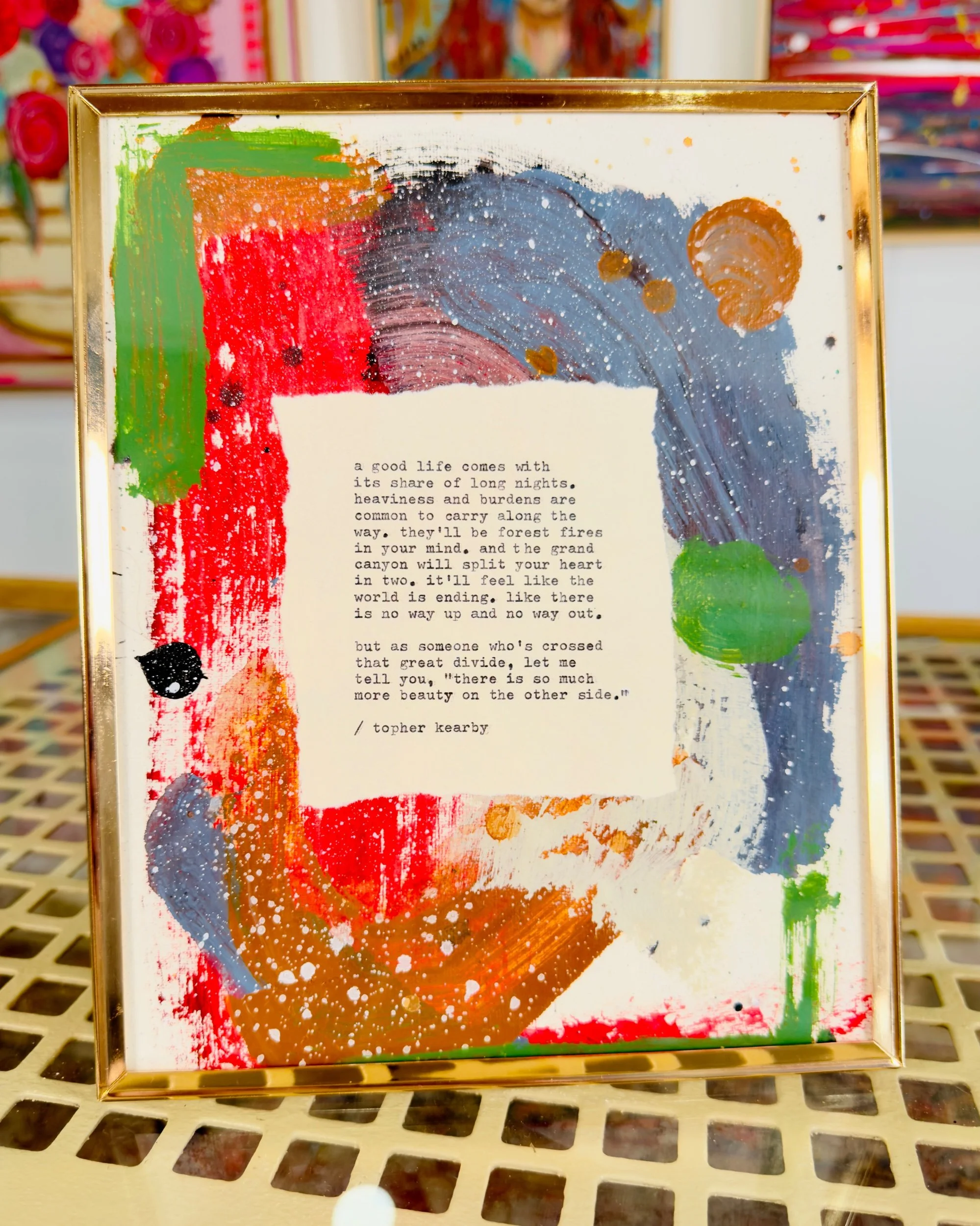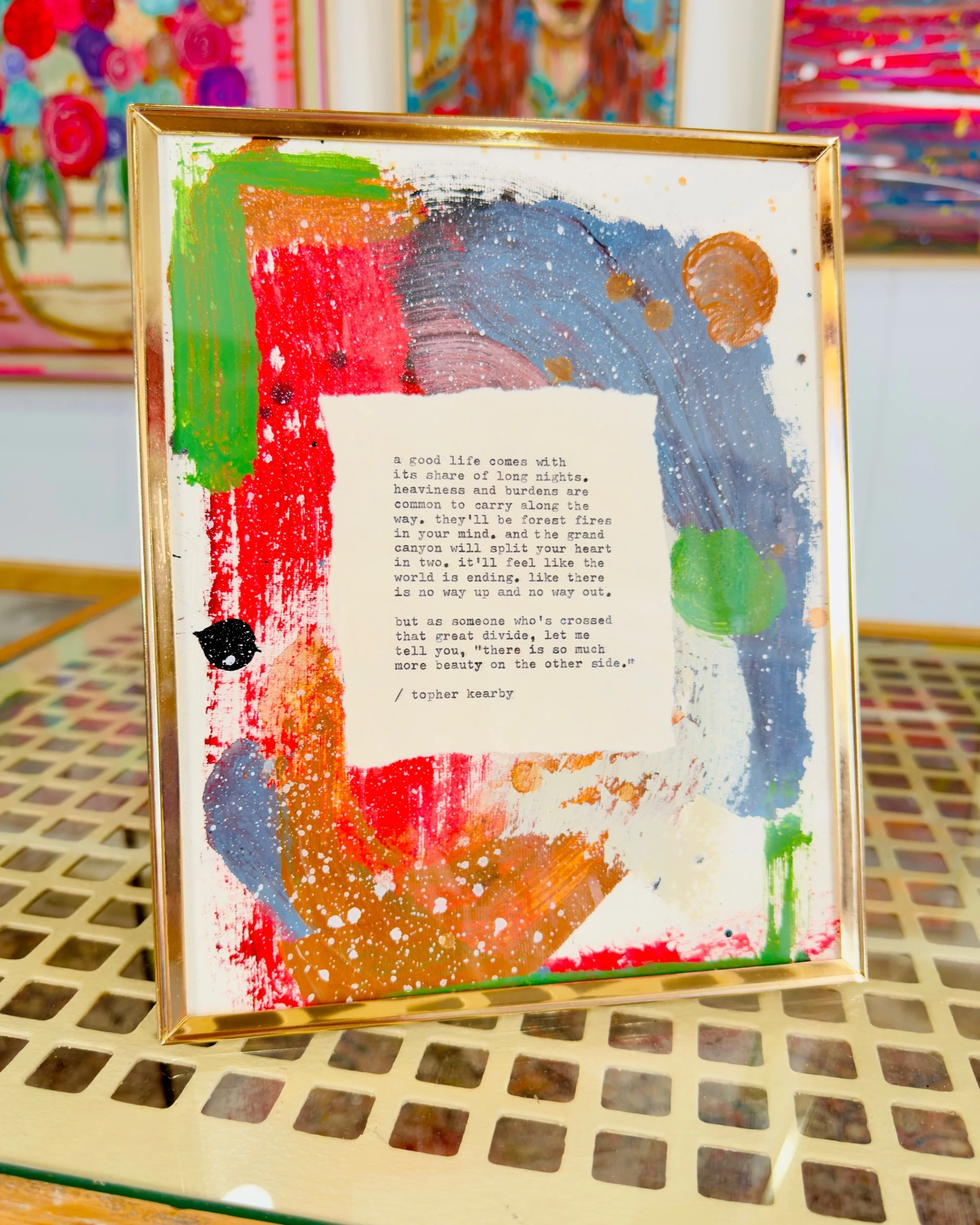 The poem is hand-typed on a vintage typewriter, ensuring it is a true original - not a print or reproduction. Behind the words, bold brushstrokes of acrylic and mixed media create a backdrop of texture, color, and movement, making every detail unique.