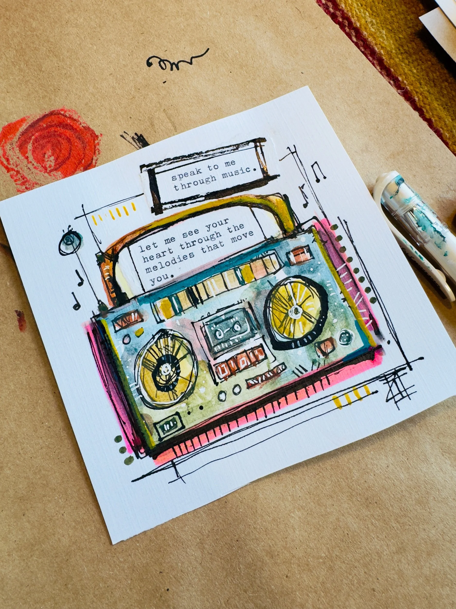 This new series blends layers of storytelling - a mix of hand-typed words, handwritten notes, and an original sketch drawn directly onto the collage. Each piece is one-of-a-kind, built on a 5”x5” wooden square and finished in a color frame that complements the artwork.