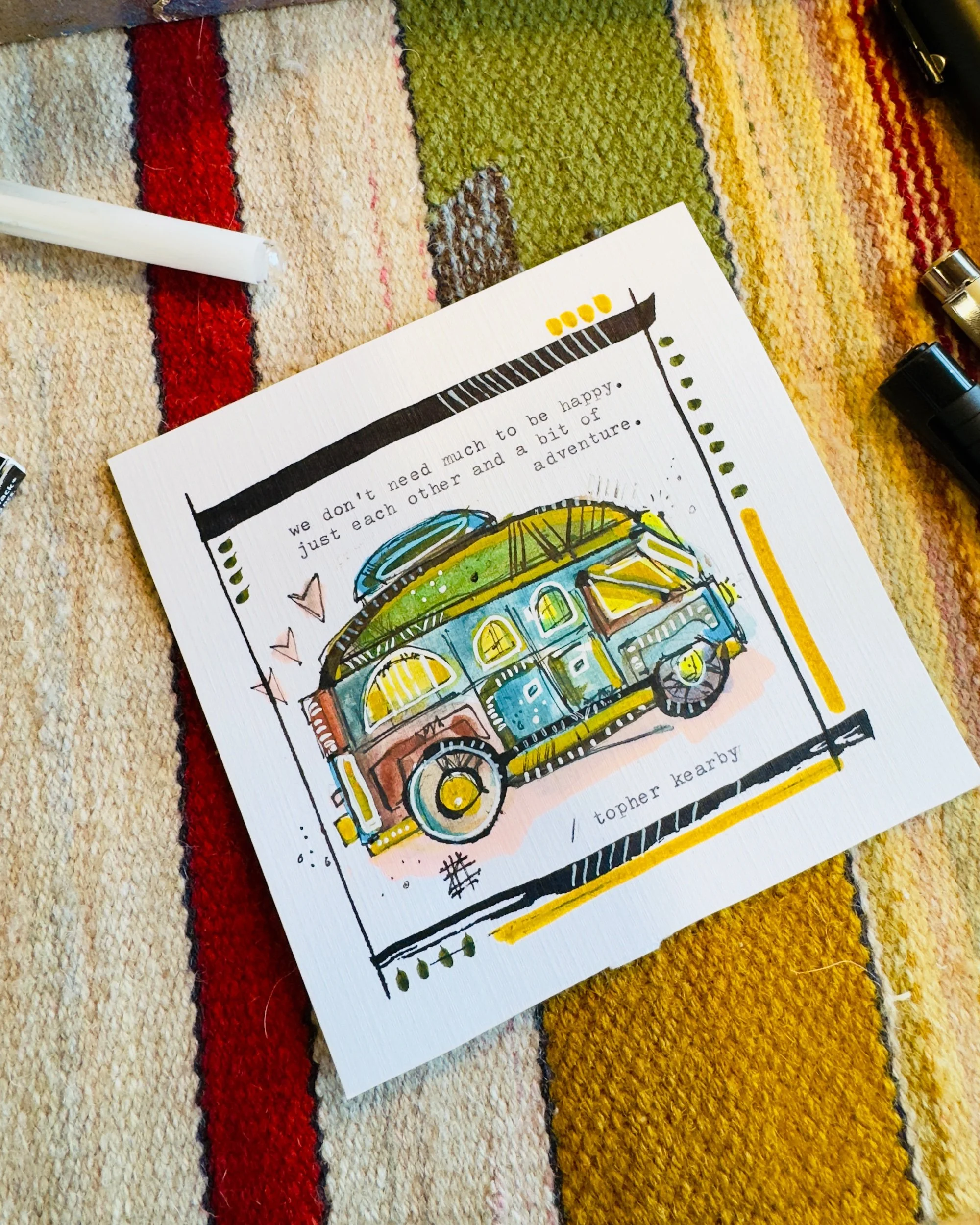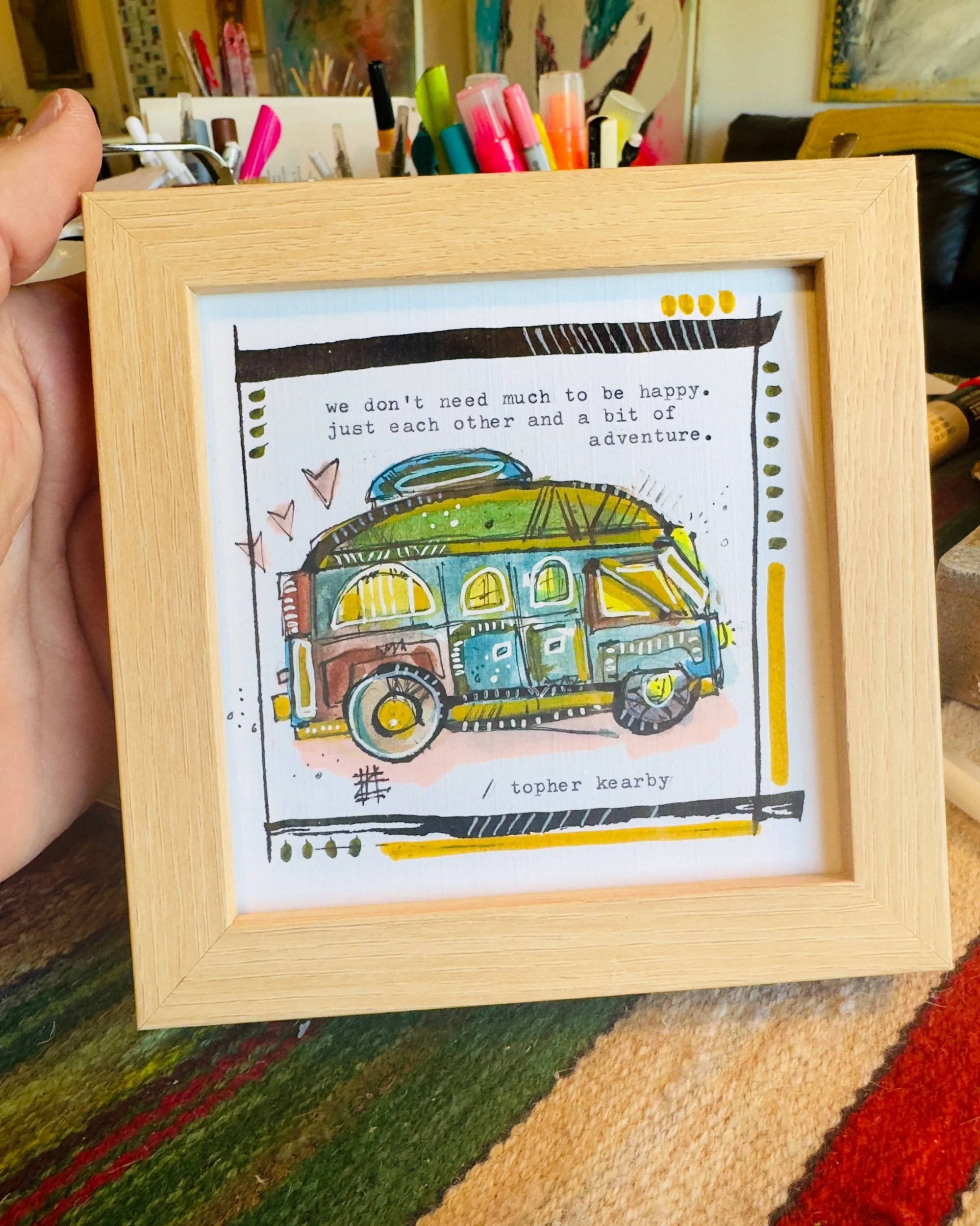This new series blends layers of storytelling - a mix of hand-typed words, handwritten notes, and an original sketch drawn directly onto the collage. Each piece is one-of-a-kind, built on a 5”x5” wooden square and finished in a color frame that complements the artwork.