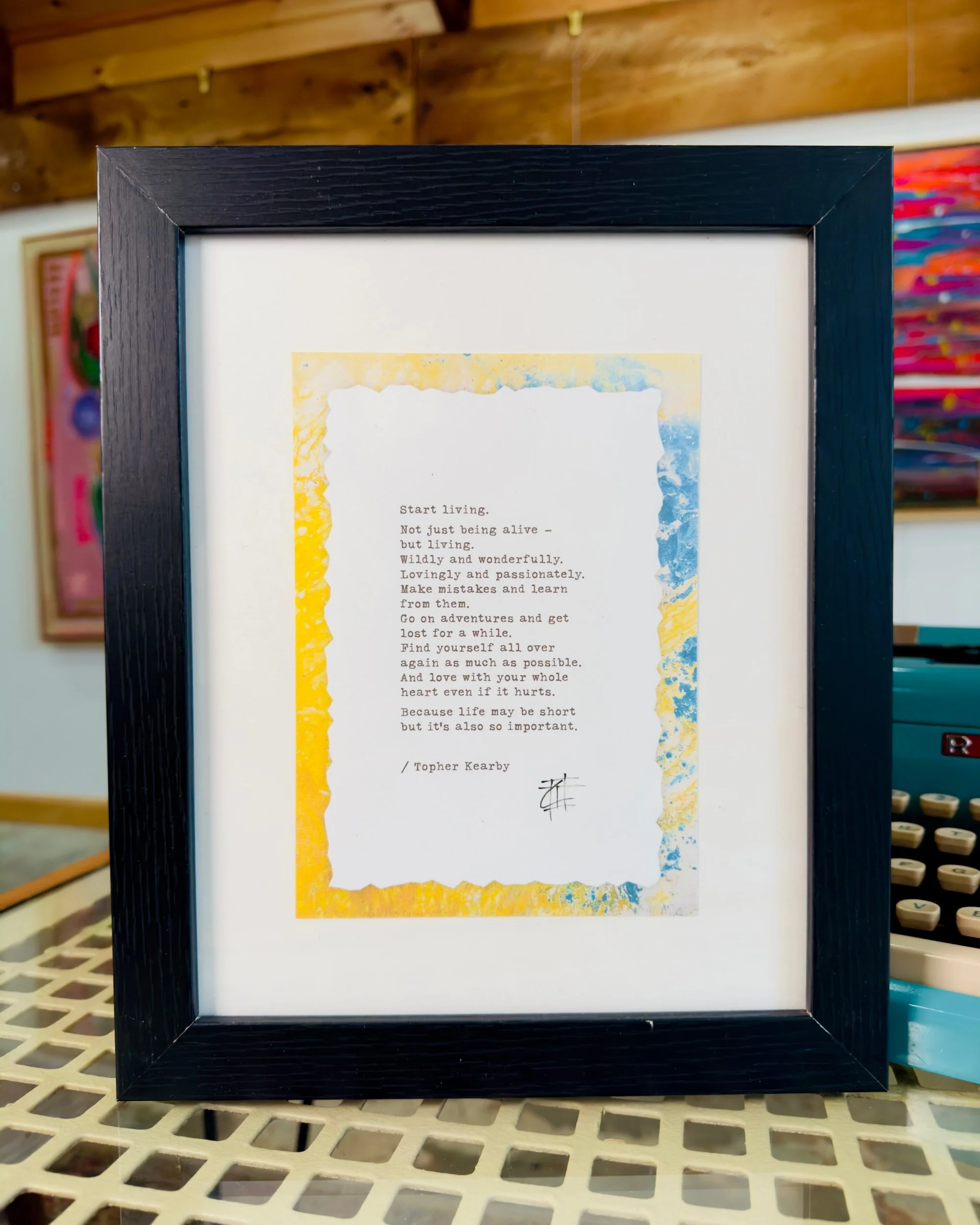 Start Living is a framed 5x7 hand-typed poetry print by Topher Kearby, beautifully presented in an 8x10 black wood frame. Each piece is printed on textured archival paper with softly marbled edges, giving it the look and feel of a keepsake.