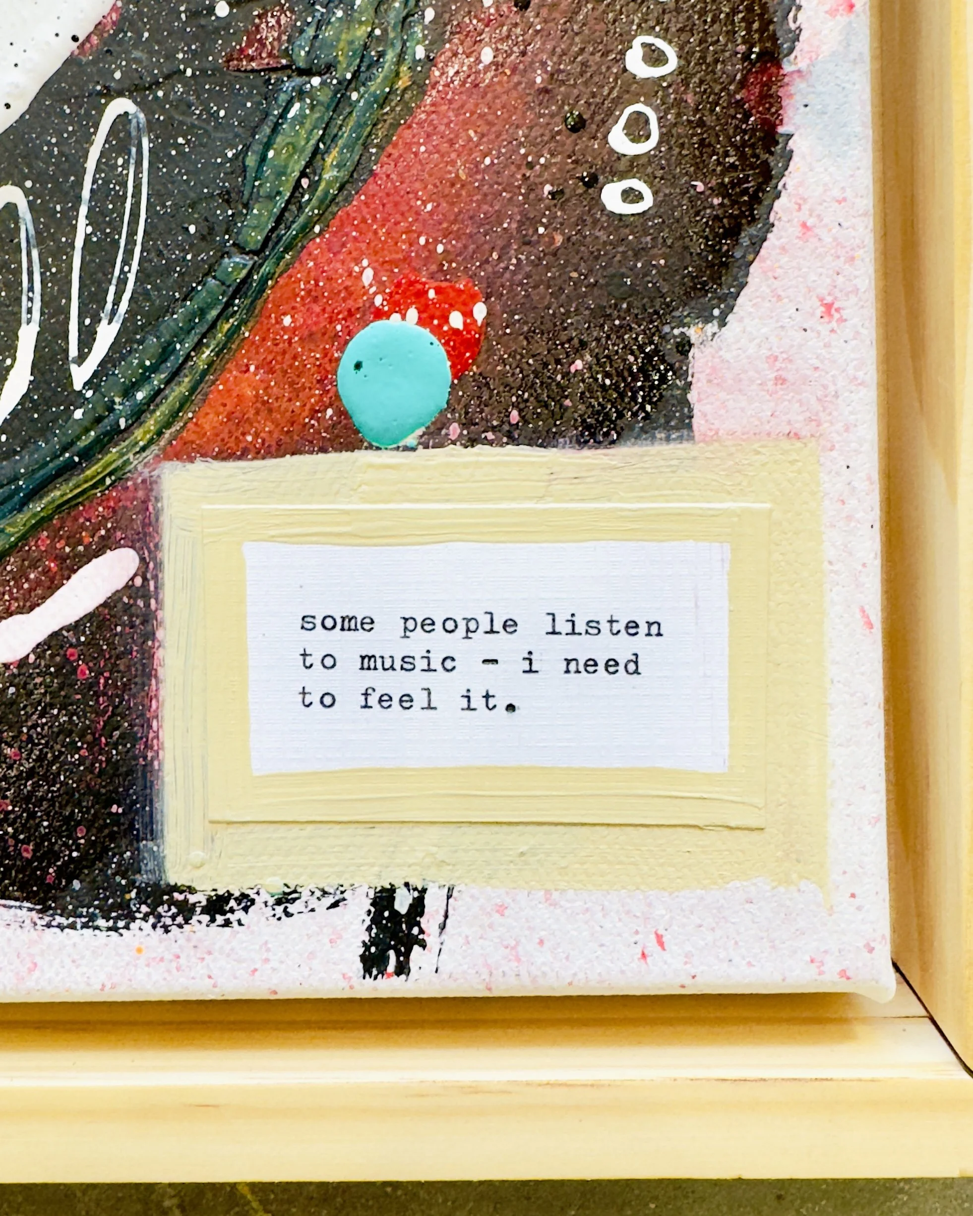 In the corner, a hand-typed poem by Topher Kearby is permanently embedded on the canvas -uniting paint and poetry into a single expression. The result is both visual and deeply human: a reminder that love, in all its imperfection, is where real life begins.