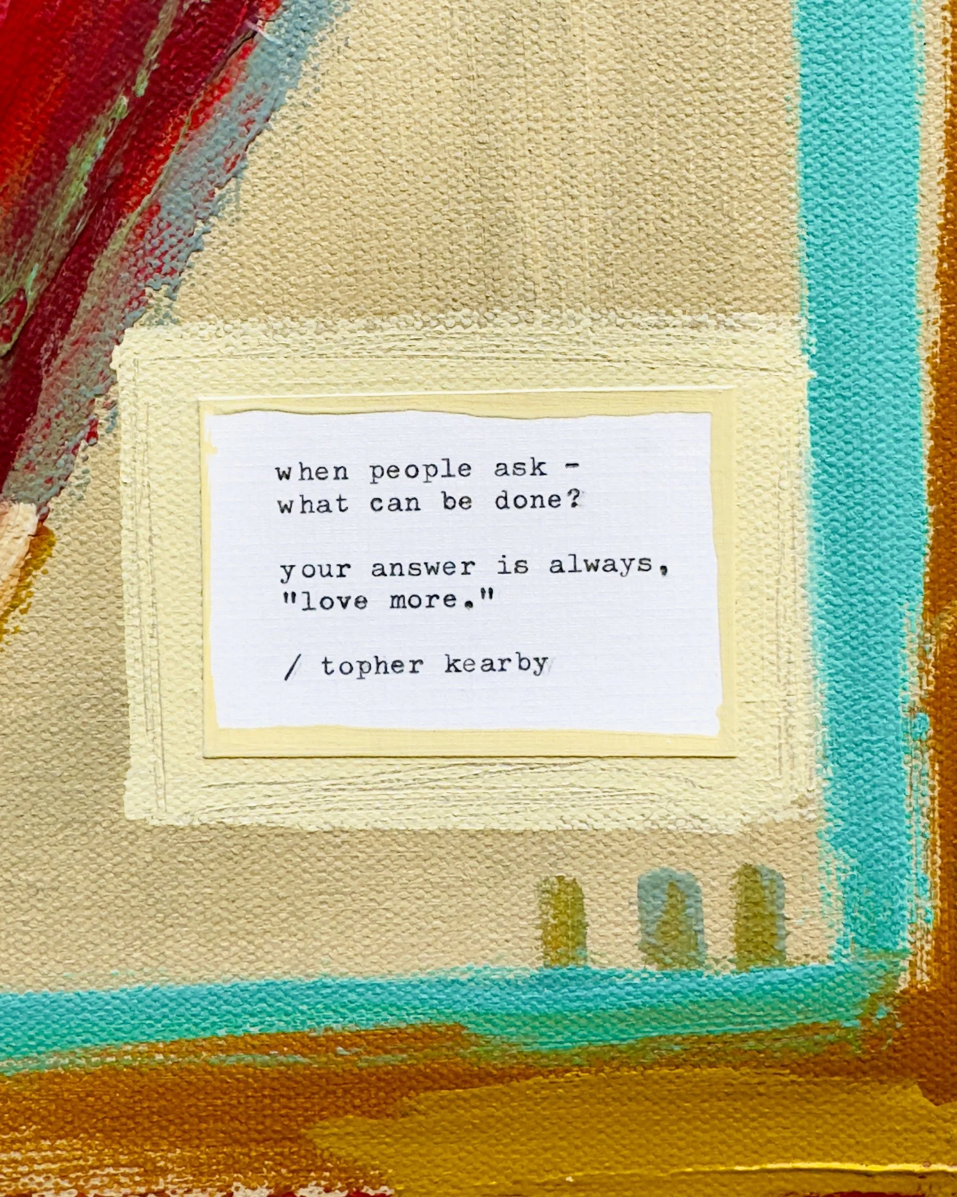Layers of magenta, black, and bright tones create a cosmic, swirling composition. At its center, a poem is hand-typed and fixed into the canvas, grounding the chaos in a simple truth.