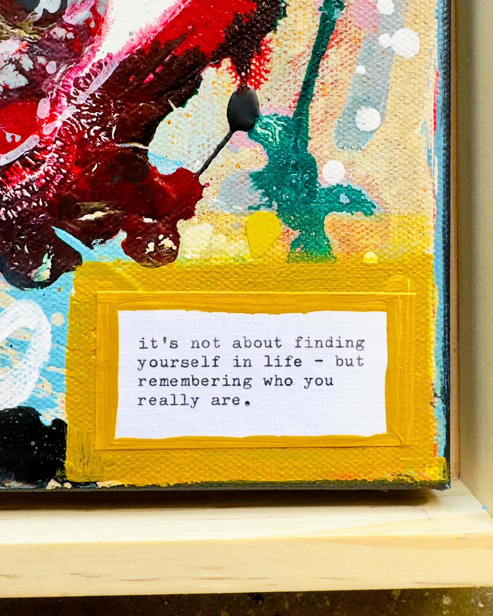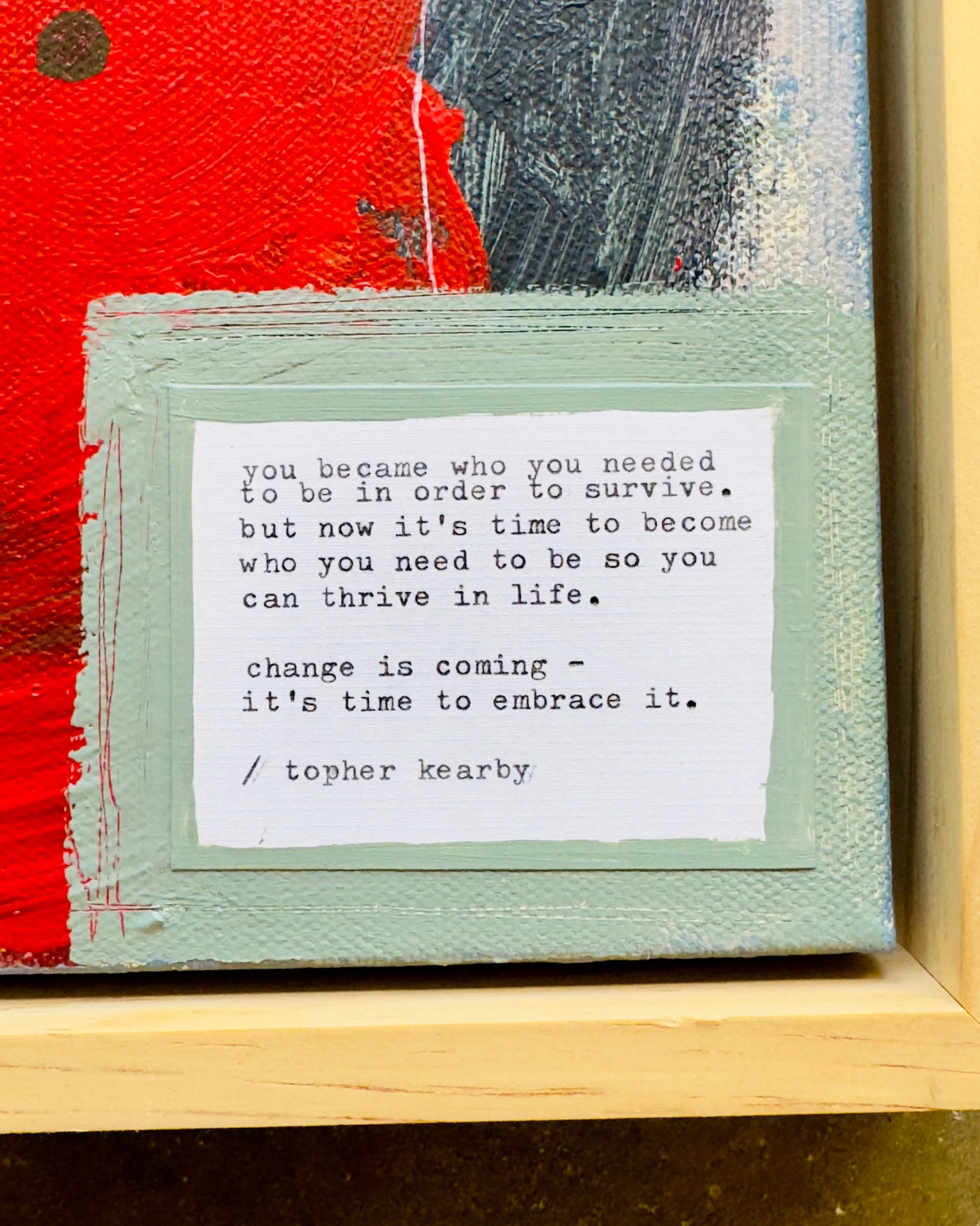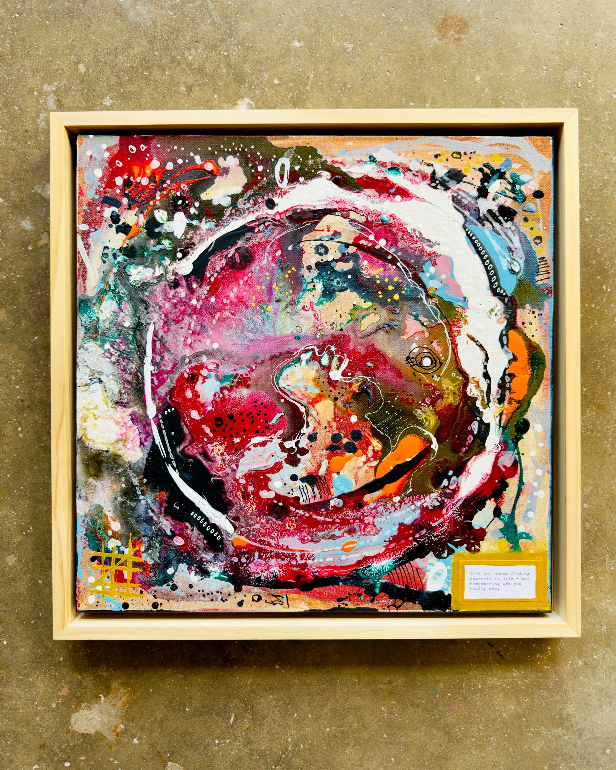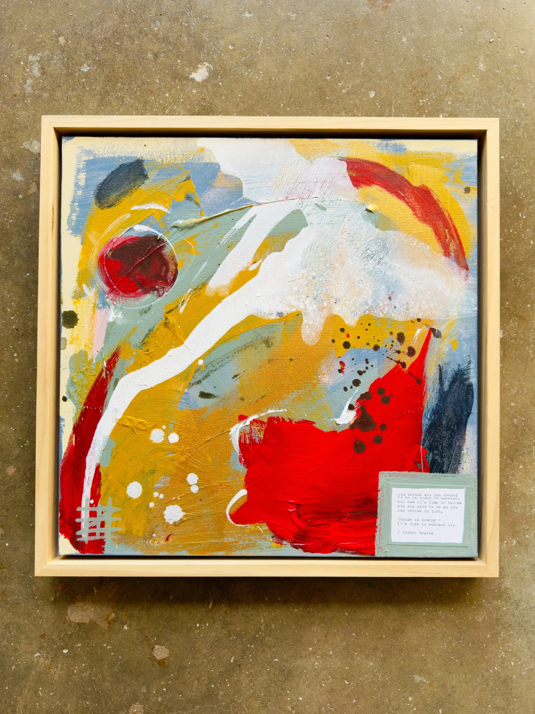 Bold reds and warm textures form a radiant heart surrounded by vibrant lines and brushwork. A hand-typed poem sits on the canvas itself, anchoring the piece with both word and color.