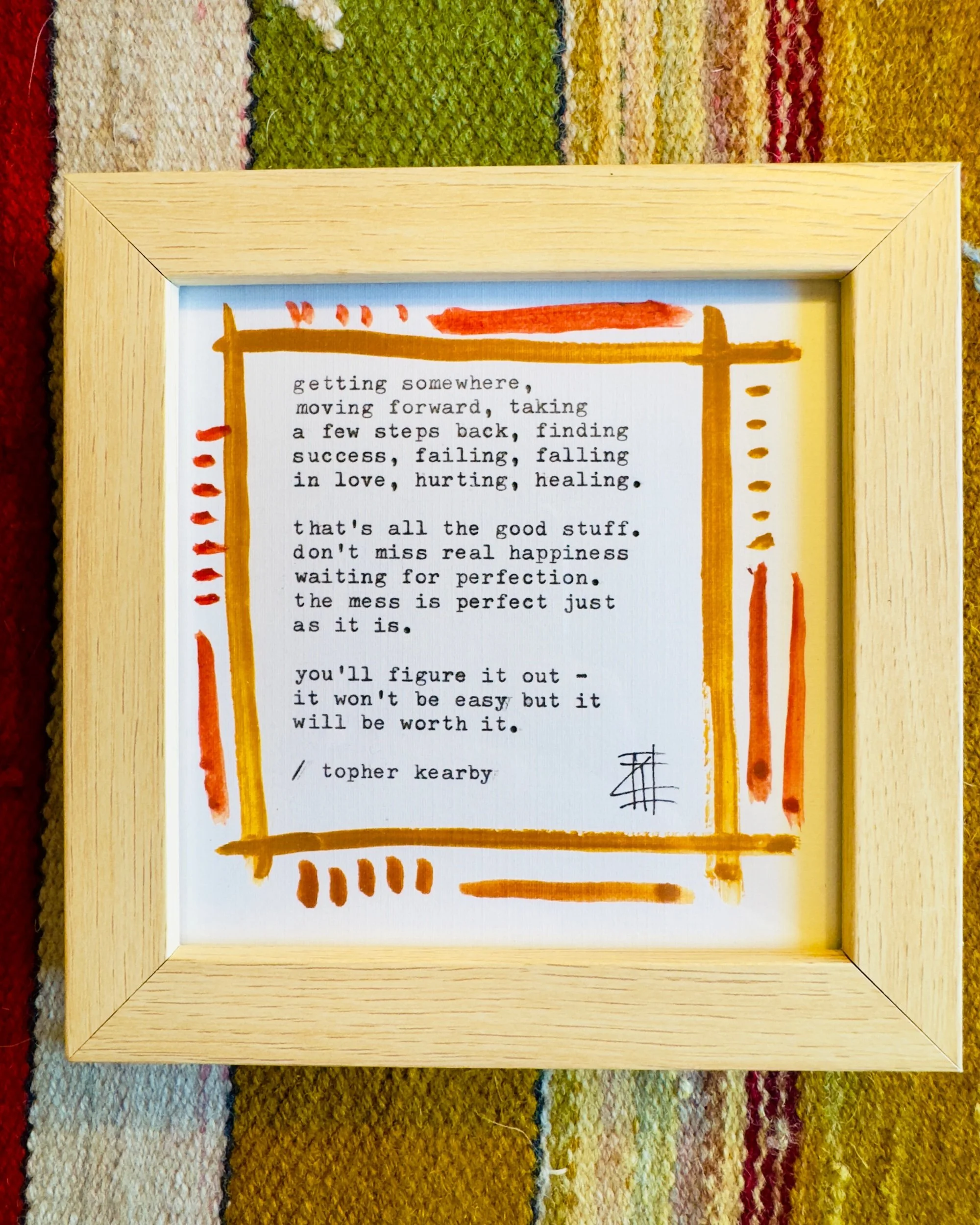 The poem is hand-typed on a vintage typewriter, ensuring it is a true original - not a print or reproduction. Behind the words, bold brushstrokes of acrylic and mixed media create a backdrop of texture, color, and movement, making every detail unique.